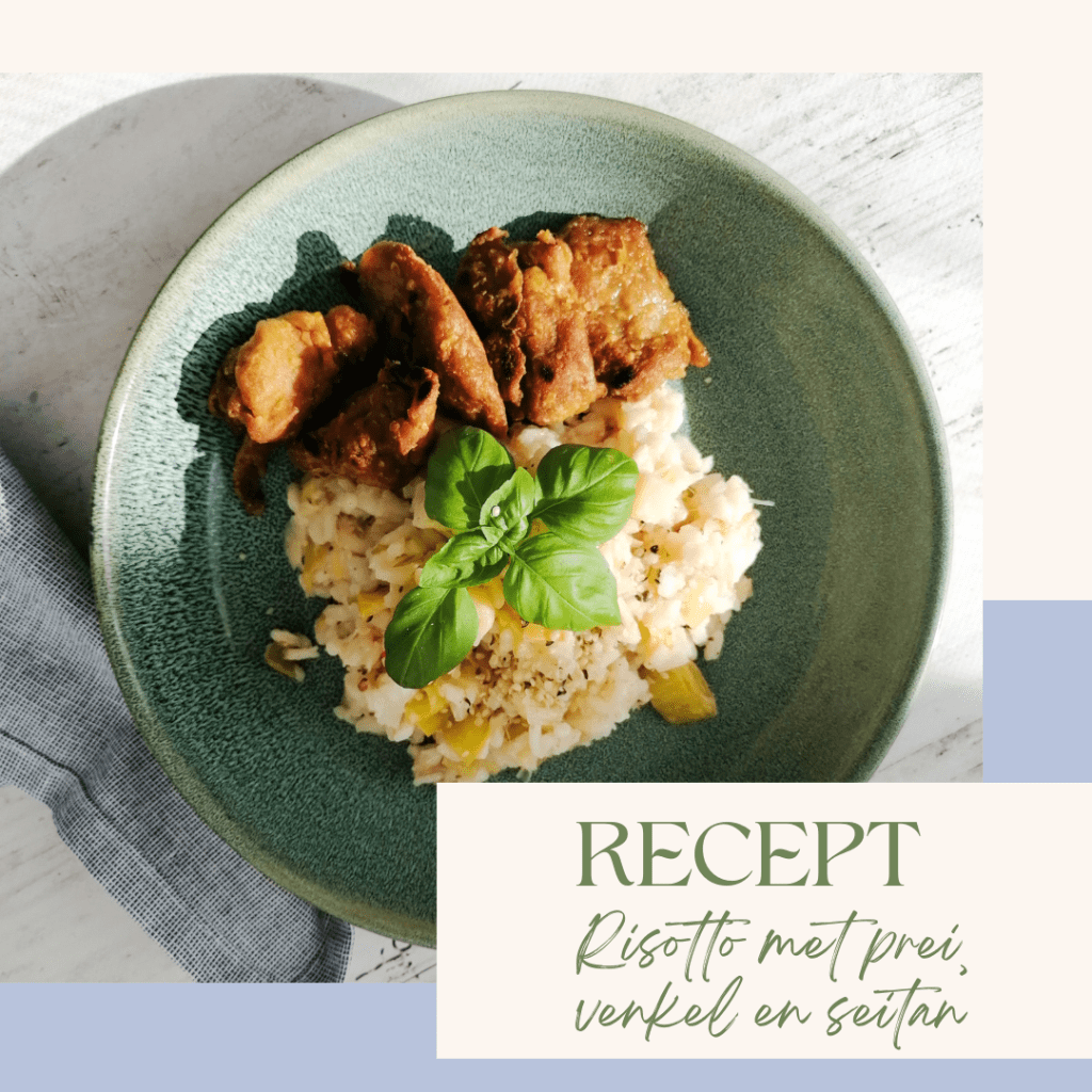 Snijd ui, knoflook, venkel en prei(wit) fijn. Doe dit in een grote wokpan met wat olijfolie en fruit aan. Doe de risottorijst er bij, samen met de groentenbouillon. Roer regelmatig tot al het vocht weg is. Proef. Normaal is de risotto nu gaar. Kruid bij met peper en zout. Voeg (vegan) parmezaanse kaas toe. Bak de seitan aan in een pan. Ik gebruikte de seitan van Maya Seitan. Bak deze even aan in de pan, en serveer bij de risotto.